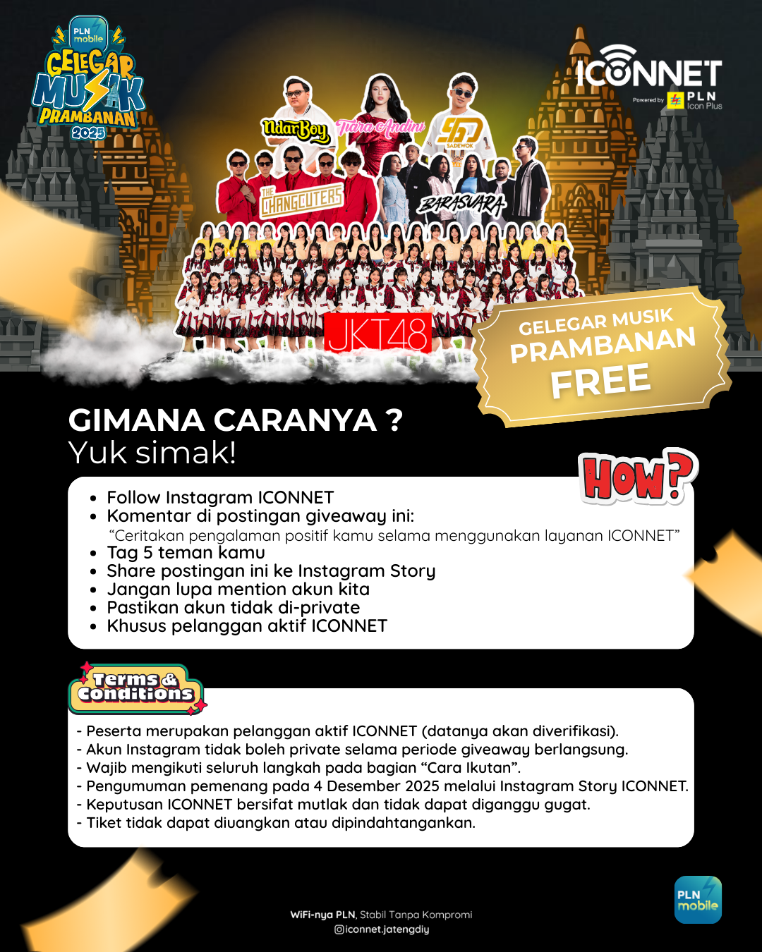 > Untuk mengikuti giveaway, kunjungi postingan resmi ICONNET melalui link berikut: Dapatkan Tiket Gratis Gelegar Musik Prambanan disini!